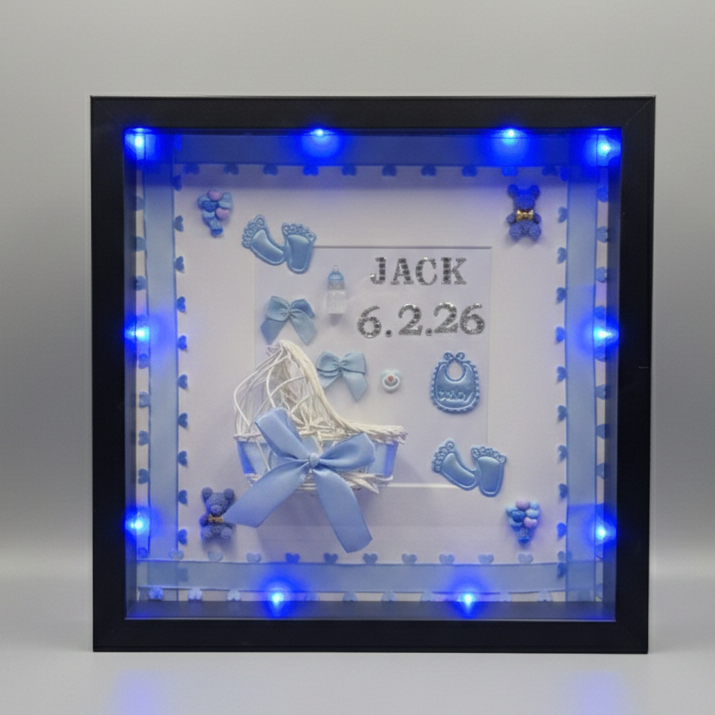 Each frame is handcrafted with exceptional attention to detail, combining diorama artistry with personalised colour schemes and name accents to create decorative pieces that tell your unique story.
